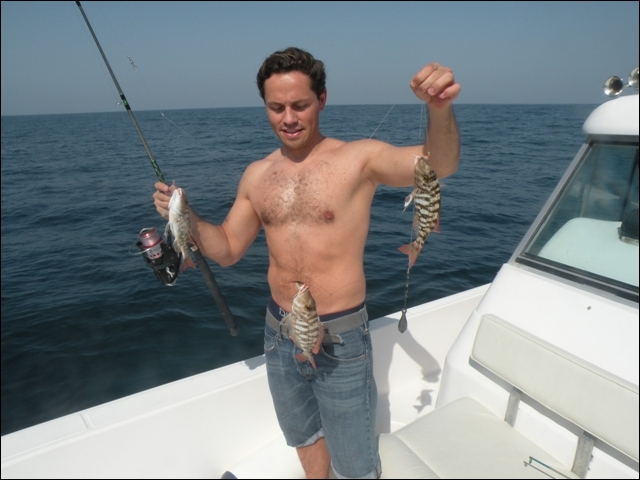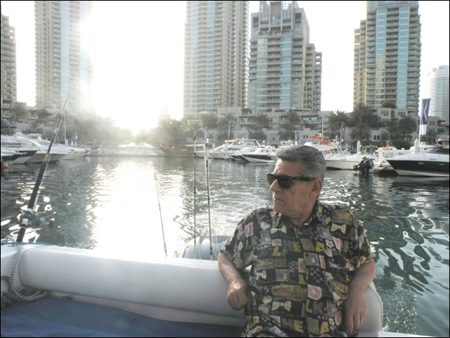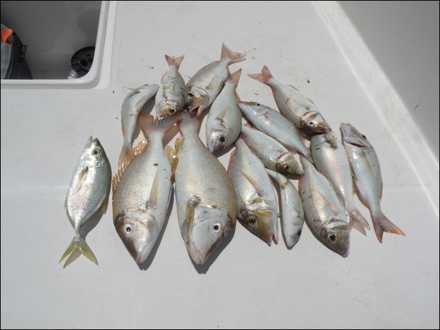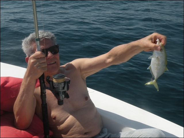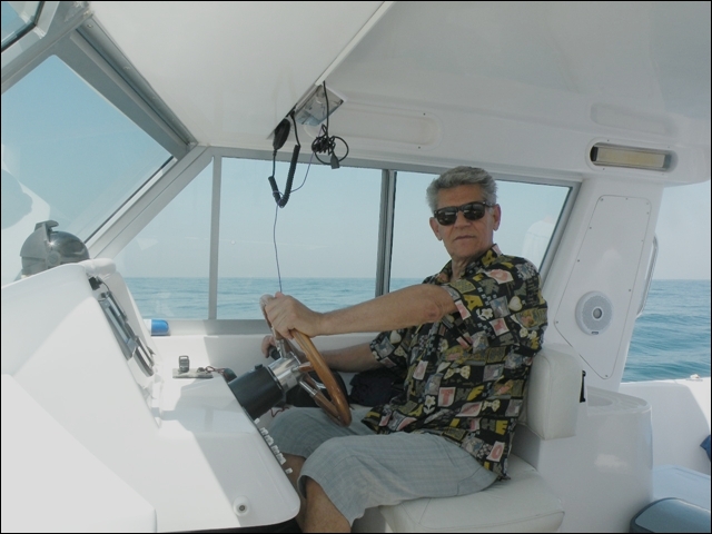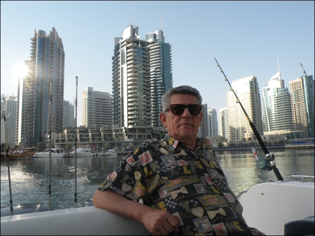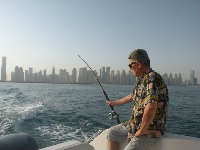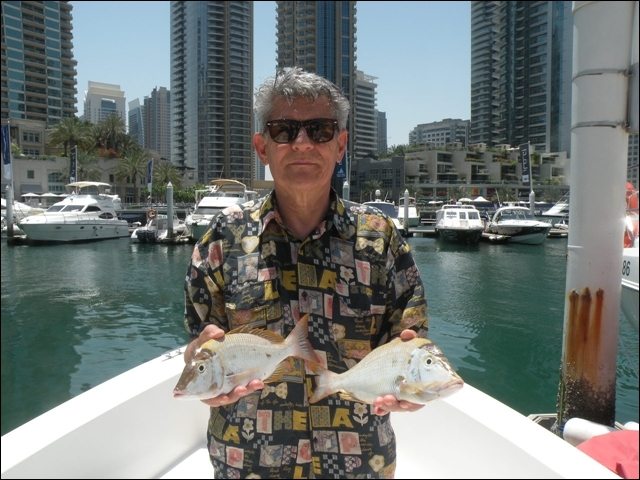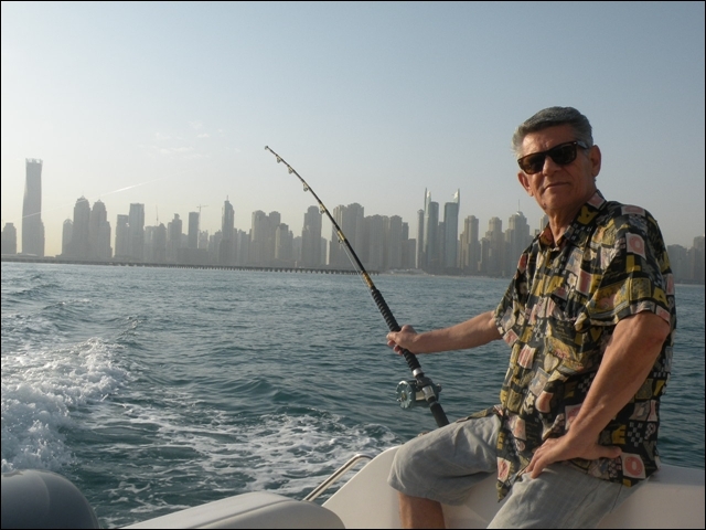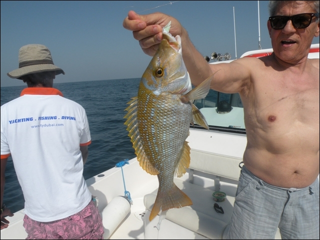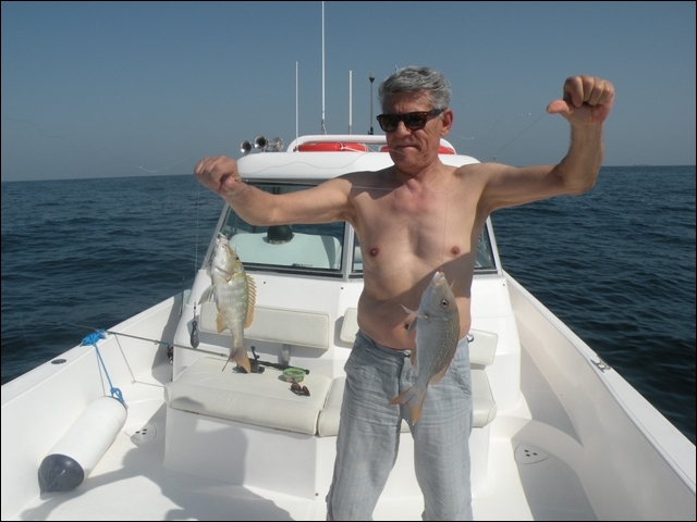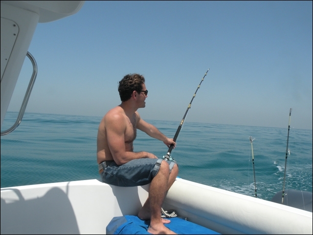 Hemen açıldık , takribi dort saatimiz vardı, hemen 25 cm lik rapalaları sağlı sollu bıraktık. balık bulucular açık dön babam dön deniz kaba dalgalı 2 saat içinde tık yok derin suya gidelim dedik , En derin su 10 kulaç bereket motor çok hızlı topuklayınca 60 mili gözlerimle gördüm 1 saat boyunca fotoğraflardaki balıkları oğlumla beraber yakaladık . Yemimiz kalamar idi. Yemli bizi kesmeyince baska yerde hamour veya baracuda için tekrar rapala saldık, bu yıl ki şansımıza başka balık alamadık. Yolda bendenize ait bir kamışı oldukça büyük tahmin ettiğimiz bir balık ikiye böldü yani kırıldı ve 50 metre kevlar misina ve 25 cm lik bir rapalayı kaybettik. Deniz tekrar kabarmaya başlayınca limana geriye dondük. Kıyı sahilde biraz denize girdik. Ancak deniz suyu sıcak oldugundan serinleyemedik. Bu sene de nasibimiz buymuş dedik . Teknede bize hizmet eden Filipinli ve endenozyalı iki çocuga tuttuğumuz tüm balıkları hediye ettik. Oldukça güzel bir hayır dua aldık. Çünki ertesi gunu yolculuk vardı pişirmek mümkün değildi.