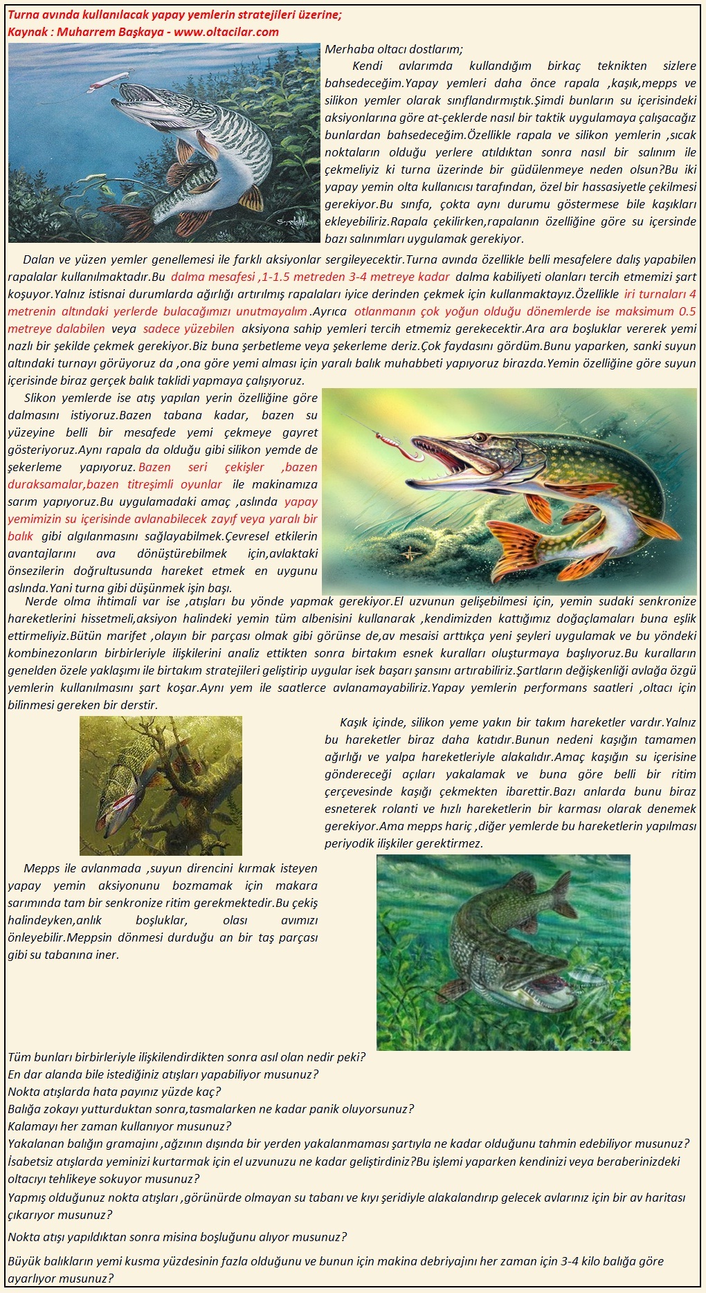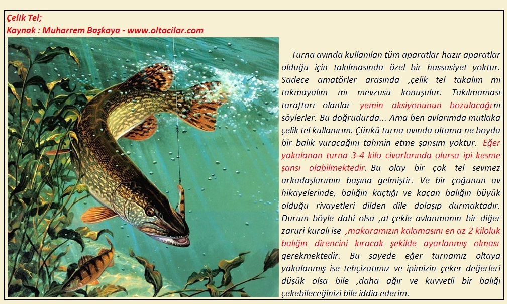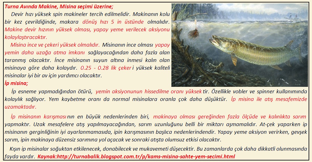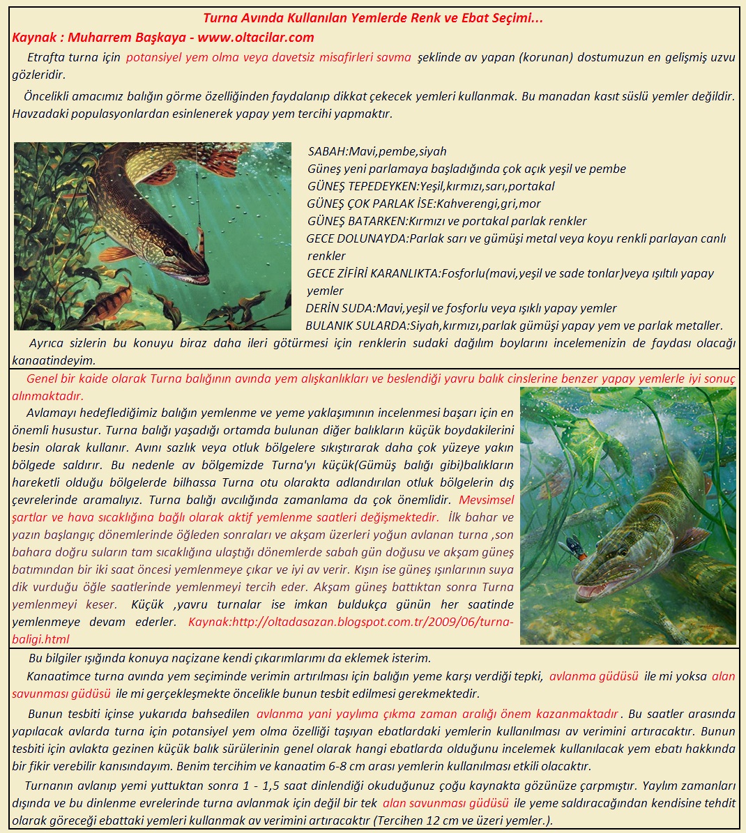 Muharrem Ağabeyim'in bilgilerinin yanında kendi farklı yerlerden bulduğum bilgilere de yer verdim. Muharrem Ağabeyime verdiği bilgilerden dolayı tekrar tekrar teşekkürü bir borç bilirim... Konunun orjinal linki: http://www.oltacilar.com/turna-balig...eri-t2370.html
